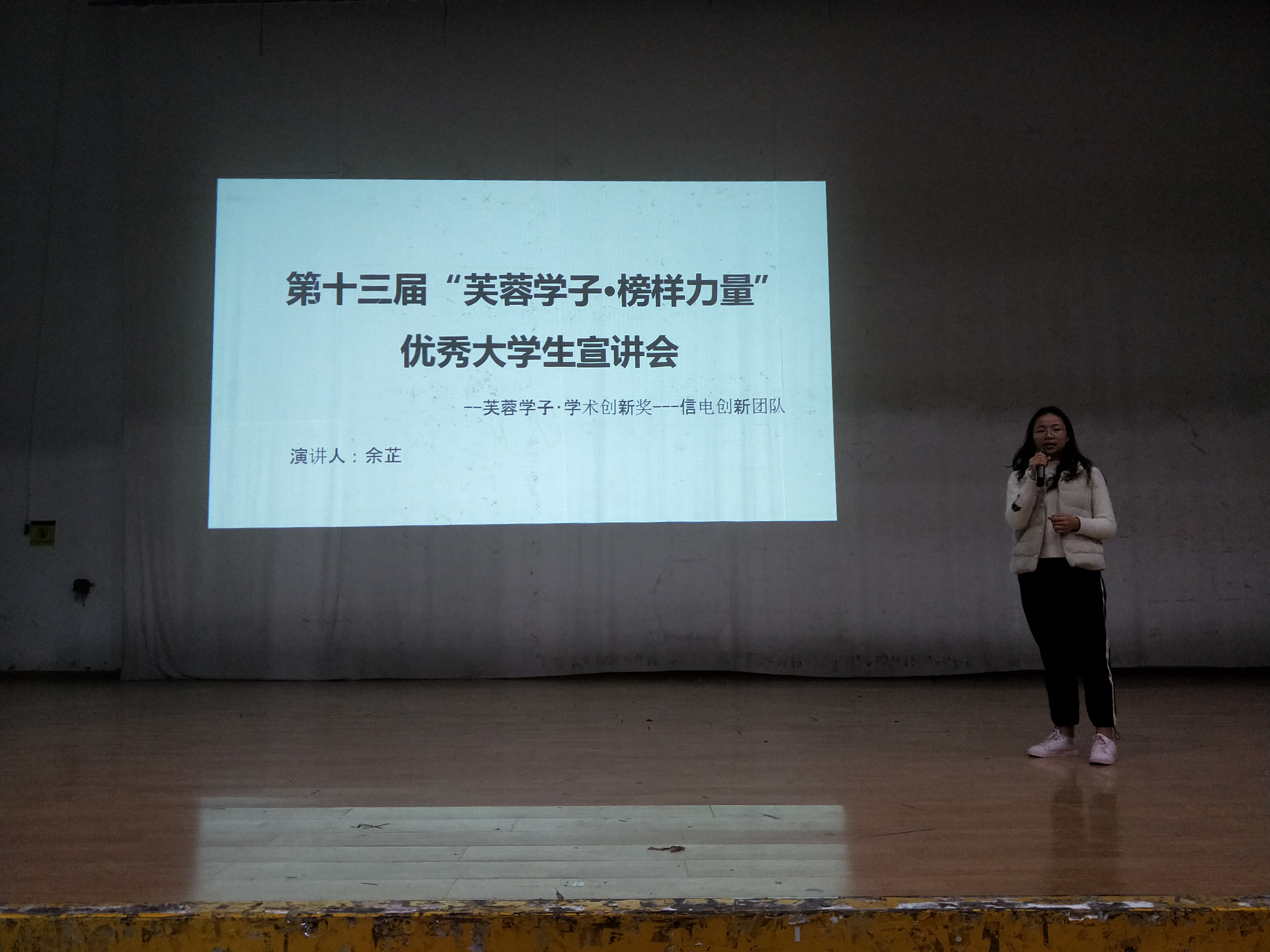 为了更好的弘扬科技创新的榜样力量,信电创新团队积极组织了三次宣讲活动。首次宣讲活动于11月24日在第五教学楼2-6室举行,在全国“恩智浦”智能汽车竞赛和湖南省电子设计竞赛等比赛中均取得优异成绩的谷振宗鼓励同学们积极参加科技创新类竞赛,锻炼科技创新能力;第二次宣讲活动于11月30日晚在南校学生活动中心进行,宣讲人余芷主要展示了团队所获荣誉并分享了学习经验;团队成员吴名广于12月2日下午在第五教学楼2-2室进行了“芙蓉学子”第三次宣讲,吴名广通过科技竞赛并以优异的成绩获得推荐免试攻读中南大学硕士学位研究生资格。作为本科推免生,他就个人的学术研究经历向听众提出在实验室要认准自己的目标,培养自学能力,克服懒惰等,积极投入到科技创新中去。