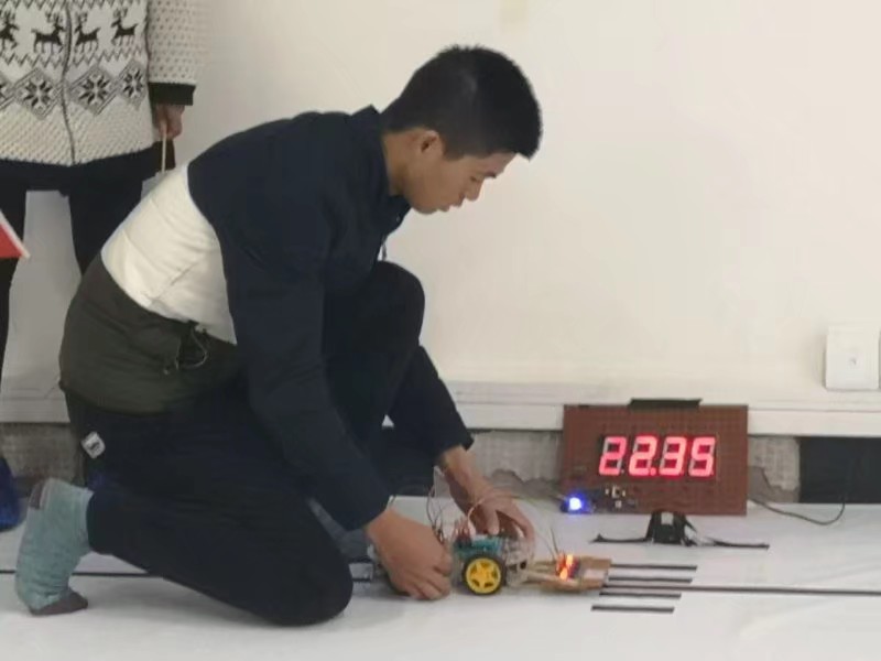 上午八点整,比赛在信息楼609测试室正式开始,609室内赛道设计的十分多样化,包含十字赛道、蛇形道、欧姆弯等,为保证比赛公平公正,赛道四个角分别站有一名裁判,在智能小车每通过一个项目之后便会举绿旗示意。参赛选手赵博文说:“我们的小车跑得很快很稳,遗憾的是插线超时了,不知道结果会是什么,大家都很强,不过通过这次比赛我学到了很多,为我打开了新世界的大门”。结果很重要,但是更重要的是看参赛者们学到了什么,相信信达杯已经为他们打开了通往电子世界的第一扇大门。