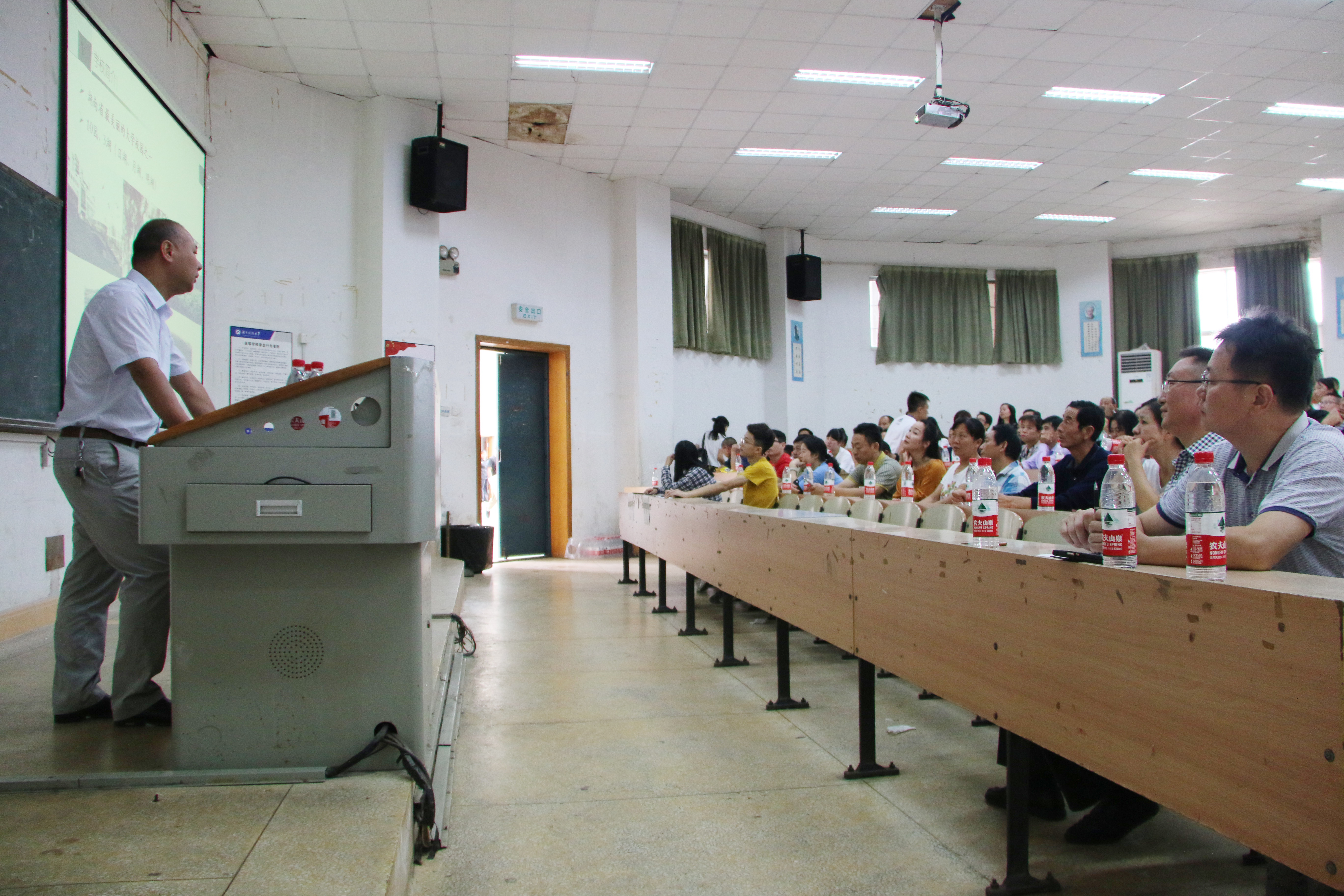 会议伊始,吴亮红用PPT就校园环境、本科专业、教学工作及科学研究四个方面对学校和学院进行了详细介绍。他重点围绕学院当前的专业设置介绍了学院成果、学科发展以及就业前景,同时列举了具有学院特色的“阳光伙伴”趣味运动会、两地书·一家人等活动。