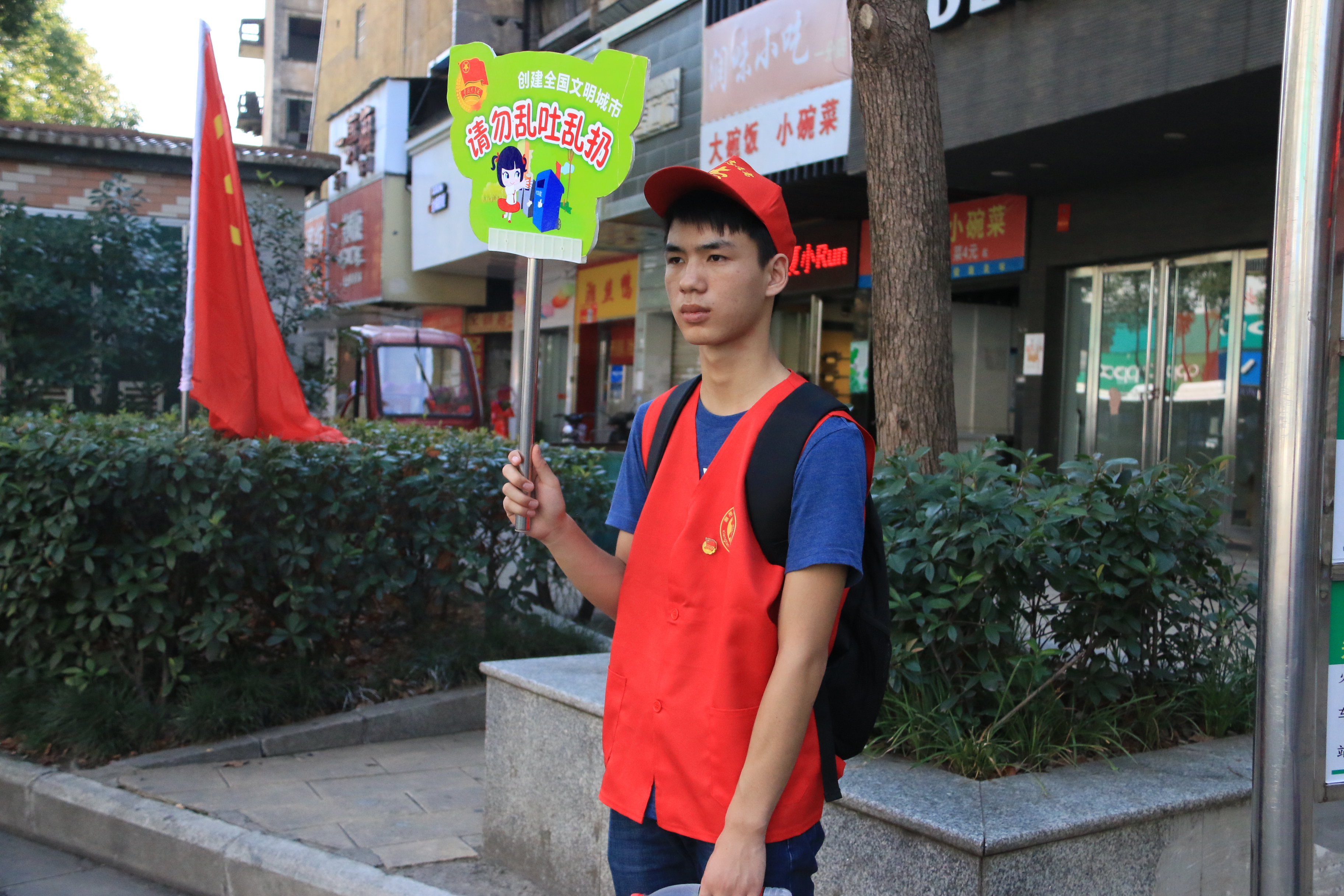 创文活动首日,信息学院共16名志愿者报名参加,活动分为上下午进行,每位志愿者都至少在规定地方站3个小时。活动现场,志愿者们在交通复杂的路口高举不要乱穿马路、不要乱丢乱吐,请遵守交通规则等警示牌,除此以外,志愿者们还帮助了行动不便的老人、手提重物的市民过马路,在垃圾桶旁提醒每一位市民把垃圾丢进垃圾桶并分类。