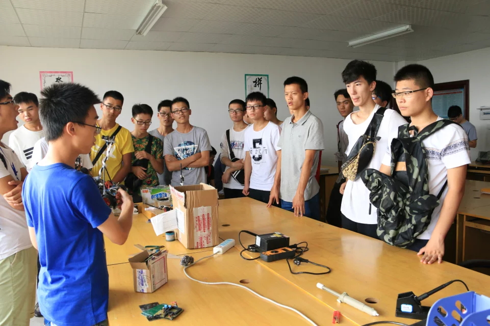 参观过程中,许多新生对实验室表现出浓厚的兴趣,并向带领参观的学长、学姐更深入的了解实验室招新问题。这之后,信息科协代表为他们介绍了智能车,并向他们展示了智能车赛跑。精彩的智能车展示后,曾老师带领新生参观了实验室展览室。精妙的科技作品让新生们大开眼界,曾老师也为新生简单介绍了各作品的制作理念和制作方法,新生们热情高涨。之后,彭老师带领新生来到信息楼二楼参观实验室,看到了许多本学院专业的实验室。信息楼实验室介绍完毕后,大一新生来到四教参观了大学专业课程实验室,分别有电路实验室、模电实验室、数电实验室、单片机实验室等,单片机实验室负责老师徐学军给新生简单介绍了单片机实验的操作和实验原理,让新生对大学单片机的实验课程有了初步的了解,感受颇多。