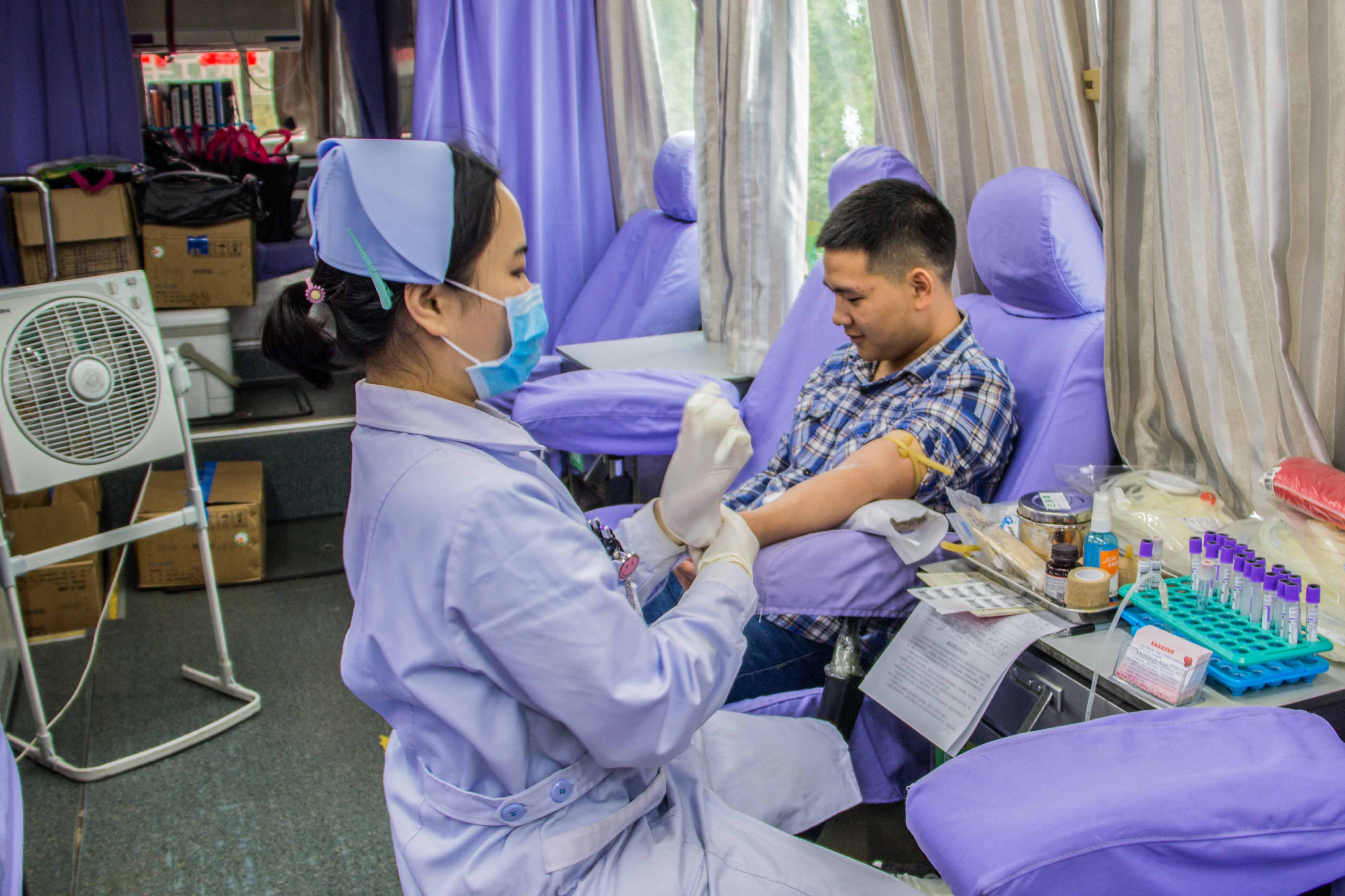 夏日的燥热并没有阻止志愿者们的工作热情,在上午十点左右,献血的设备基本到位,志愿者们做好了充分的准备后各司其职、分工合作,有在流动车内配合采血护士的工作的志愿者,也有为前来献血的同学介绍献血知识和解答献血者困惑的志愿者。而献血者们都面带着笑容,在整个献血过程中都显得非常有勇气。一位16级的献血者在献完血后说: “献血是一件让人很骄傲的事,因为这是在用血液传递爱心,用爱心拯救生命。”