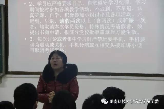 随后,肖善芳介绍了党校学习要求及注意事项,并且详细介绍了党校学习课堂要求、学习要求、考核原则、考核管理等规定。鼓励大家努力学习党的有关理论,加强对党政策、理论方针的理解,通过对毛泽东思想、邓小平理论、三个代表等重要思想理论的学习来开拓自己的视野。希望学员们珍惜本次党校培训机会。