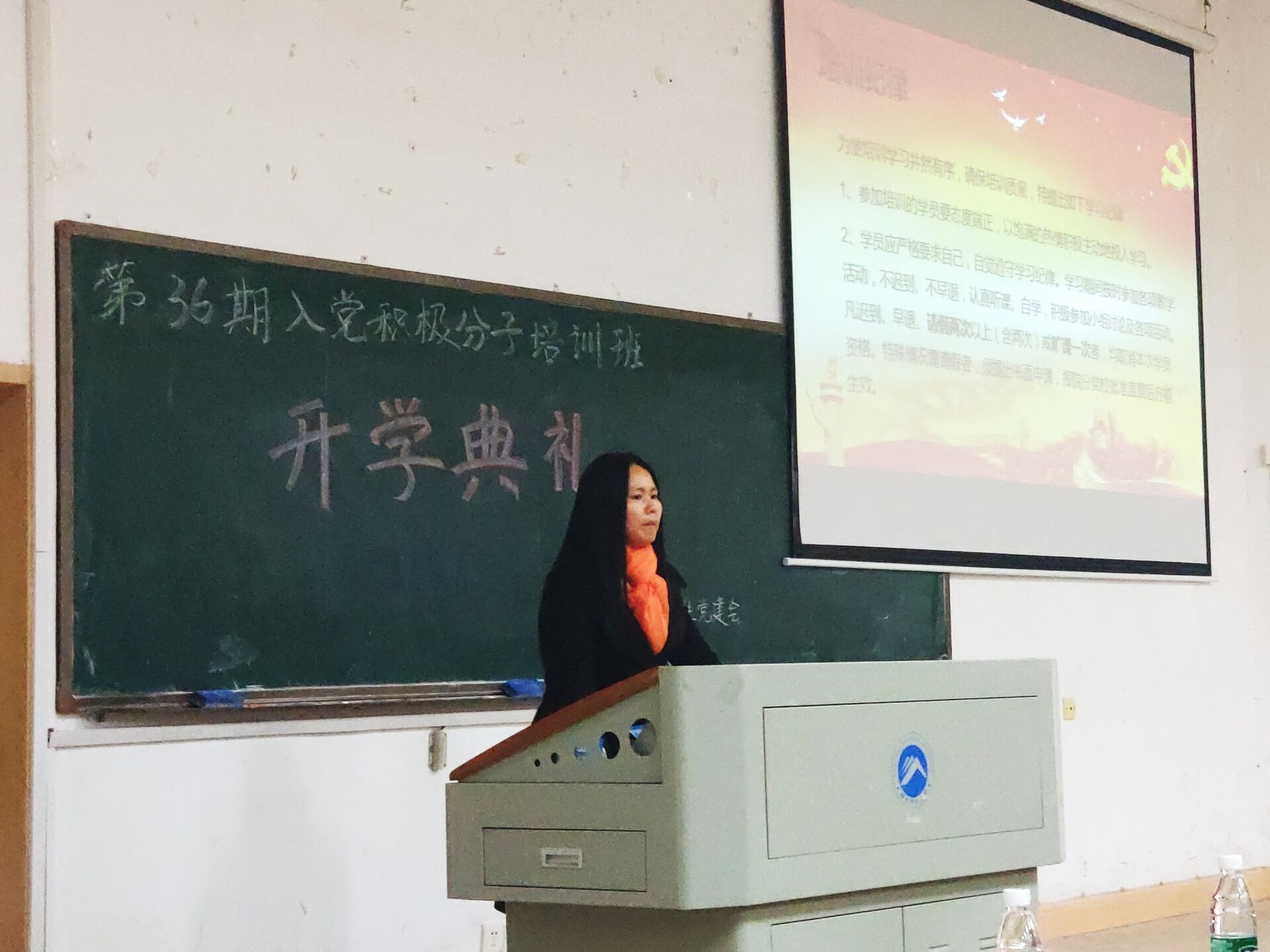?开学典礼在激昂的国歌声中展开。肖善芳老师为大家详细解说了本次培训的重要性,并提出了本次培训的学习纪律,同时表达了对参与培训学员的认可与期待。随后。刘丹老师公布了此次培训的班组长名单,并对班组长未来工作进行指导。 最后,班长姜浩同学阐述了自己对党的看法以及作为入党积极分子应当遵守的准则。