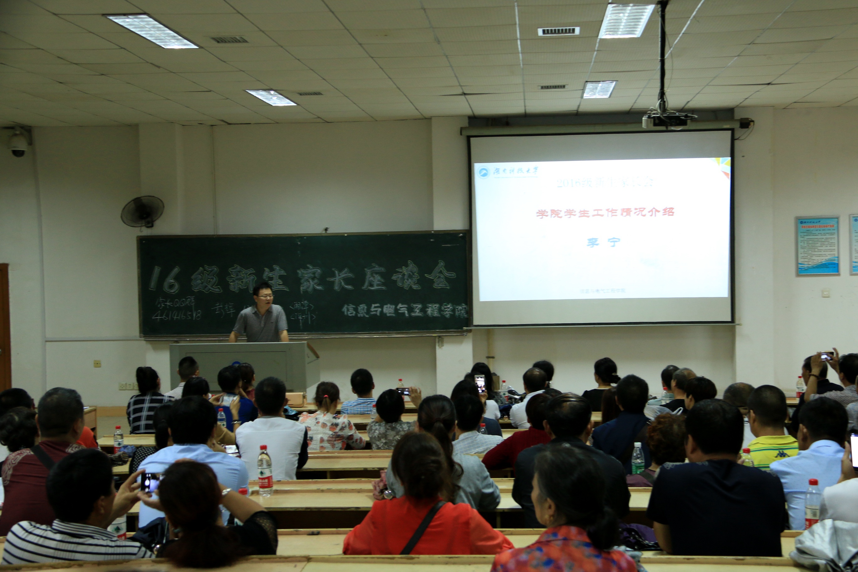 会议期间,副书记李宁向家长们具体介绍了学生工作。李宁老师通过大学和高中的学习生活比较向家长们介绍大学的特点,通过往届优秀学生的经验号召家长们要求孩子在大学内树立一个目标。“我们学院非常重视学生的思想建设和学风建设,我们有“两地书,一家人”的特色活动,有优秀的创新实验室为培养学生的创新意识、创新能力提供了平台,希望家长们与学校一起重视孩子的心理健康。”李宁老师说道。会议最后,彭辉老师详细的介绍了自己对16级学生的管理方式,并表示自己将会密切关注每一位学生的生活和学习,希望家长们在以后的工作中能够配合。