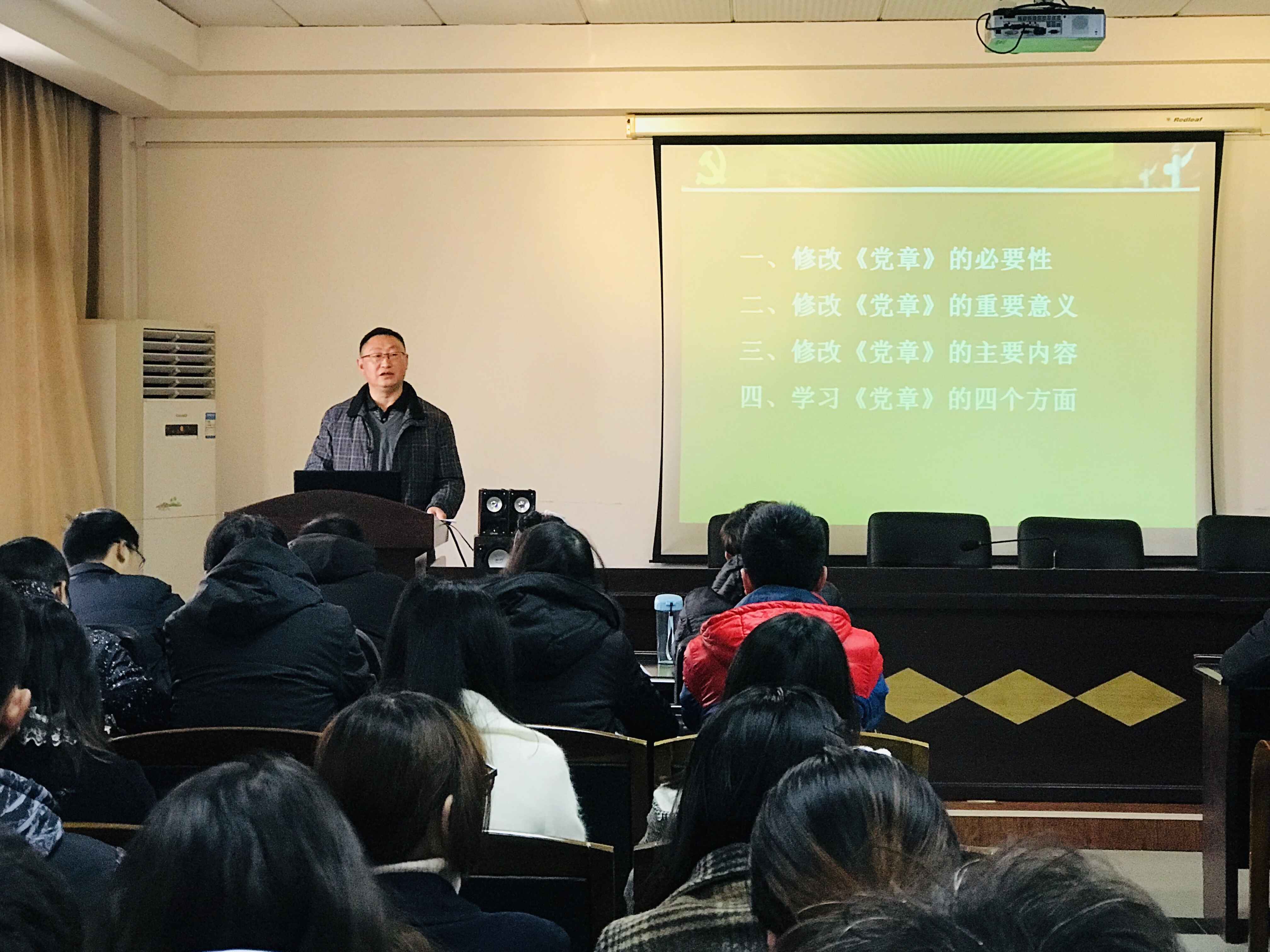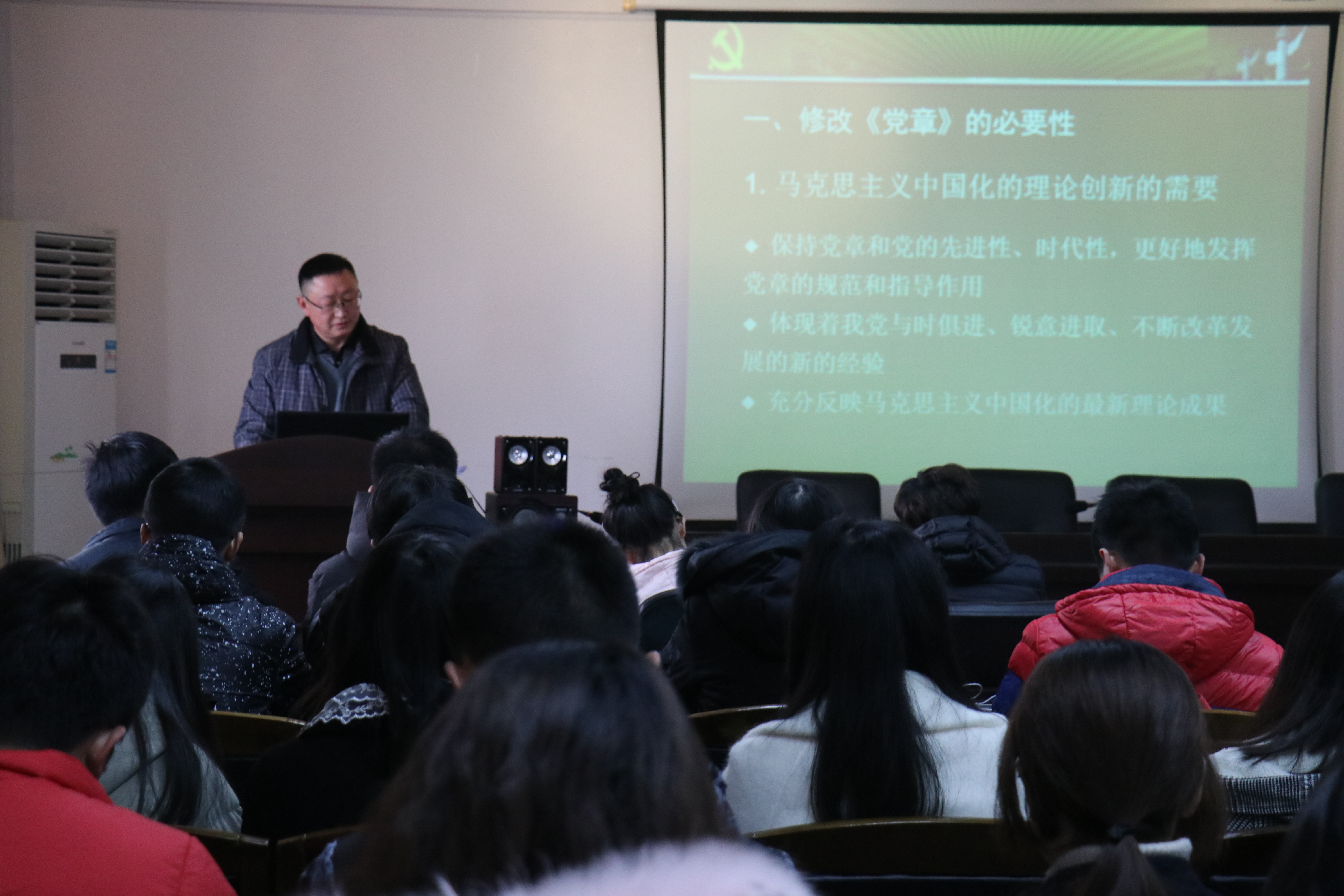 王鹏飞首先为学生党员讲解了此次《党章》修改的必要性和重要意义,让同学们更加深刻地了解《党章》修改的背景和目的,随后他就此次《党章》修改的内容为学生党员做了详细介绍,他特别强调要从核心、根本、关键、实质四个方面去学习《党章》,同时要求大学生党员要在日常学习和生活中学会贯彻和落实党的十九大精神。最后,他要求学生党员牢记为人服务宗旨,时时处处模范带头,充分发挥好党员先锋作用。